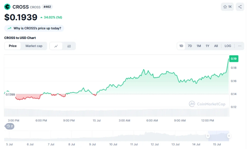 15日(韓国時間)午後2時22分現在、クロスは前日比34.02%上昇の0.1939ドルを記録しています。