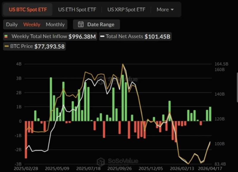 - 米国の ビットコイン現物ETF には4月13日〜17日の1週間で9億9638万ドルが純流入し、2026年1月中旬以来の最大規模となった。
