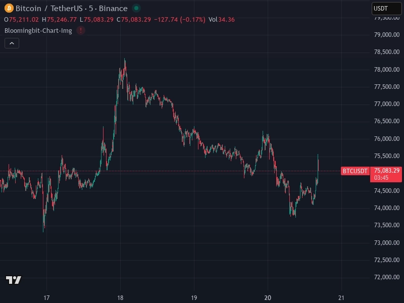 ビットコイン(BTC/USDT)は直近1分で0.1%下落し、現在は7万5139.33ドルで取引されている。