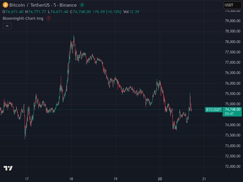 ビットコイン(BTC/USDT)は直近1分で0.13%上昇し、現在は74,765.26ドルで取引されている。