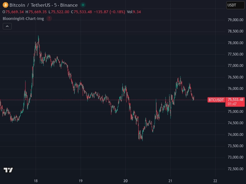 ビットコイン(BTC/USDT)は直近1分で0.1%下落し、現在は7万5522.01ドルで取引されている。