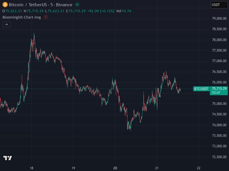 ビットコイン(BTC/USDT)は過去1分間で0.1%上昇し、現在は7万5696.17ドルで取引されている。