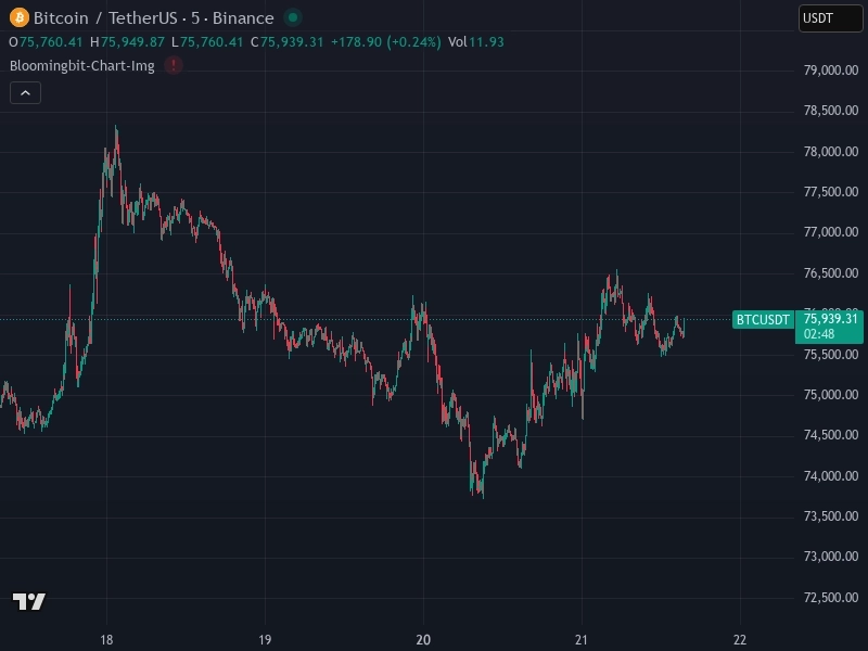 ビットコイン(BTC/USDT)は直近1分で0.17%上昇し、現在は7万5939.3ドルで取引されている。