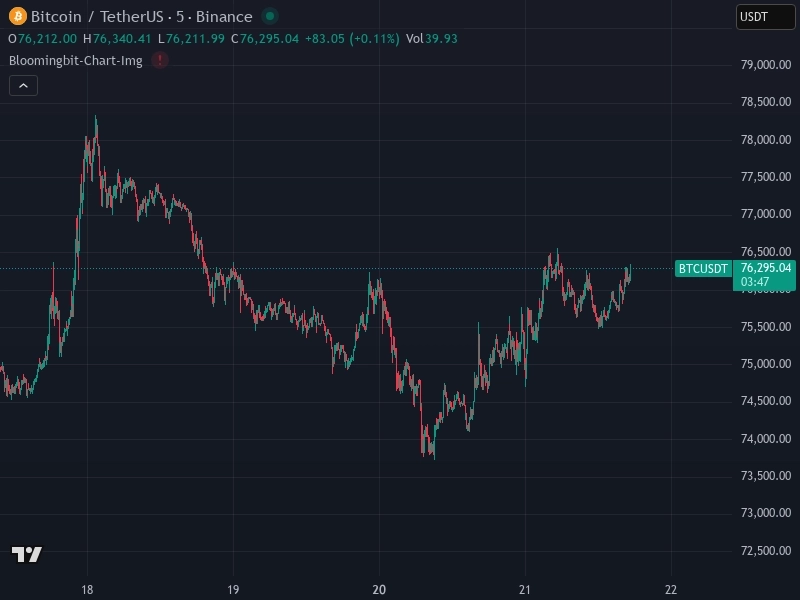 ビットコイン(BTC/USDT)は直近1分で0.15%上昇し、現在は7万6327.52ドルで取引されている。